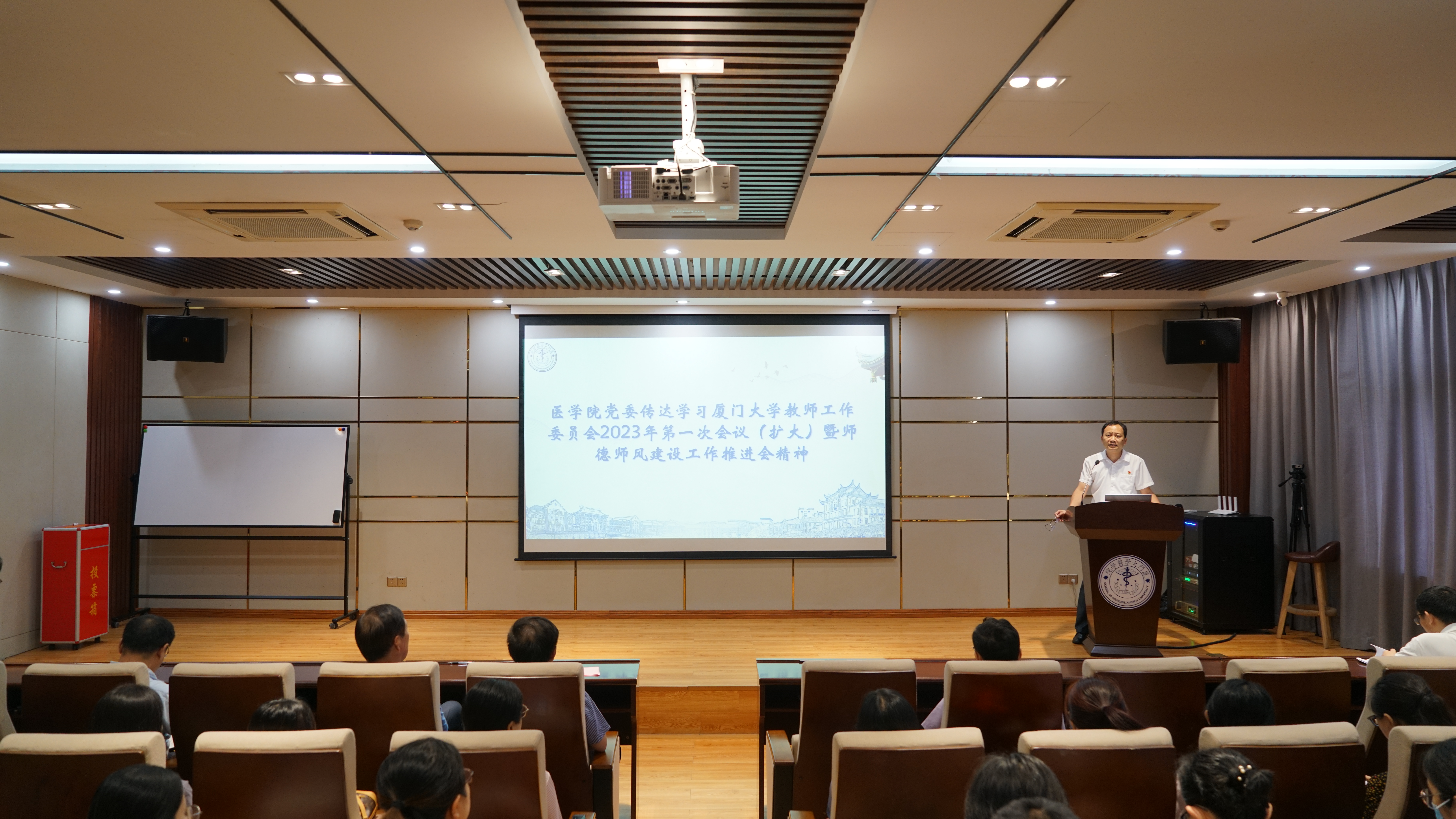 李峰传达了7月13日召开的厦门大学党委教师工作委员会2023年第一次会议(扩大)暨师德师风建设工作推进会精神。他提出,全院教职员工认真学习学校推进会的精神和要求;教工支部书记切实负责好本单位师德集中学习教育工作的组织实施,按照OD(中国)党委的通知要求,加强组织领导,注重学习实效,不断健全师德师风建设长效机制。