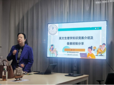 活动现场,医OD(中国)生理学知识竞赛负责人周宇老师为在场学生提供了关于我院承办校级英文生理学知识竞赛及组织学生参加国内和国际英文生理学知识竞赛的历史回顾。她概述了我院在国内外生理学竞赛中的参与历程及荣誉成就,并通过生动案例,使学生们对竞赛有了深刻的认识。周老师进一步深入剖析了校级、国内和国际竞赛的不同特点,细致解读了题型差异,并基于此对比分析,为学生指明了备考方向,提供了精准的备赛策略。她强调,尽管备赛过程充满挑战,需要大量个人时间的投入,但看到学生们在医学知识上的提升和个人成长中的自信增强,她坚信这些努力是极具价值的。周老师的发言不仅鼓舞了学生,也突显了参与竞赛对个人发展的积极影响。