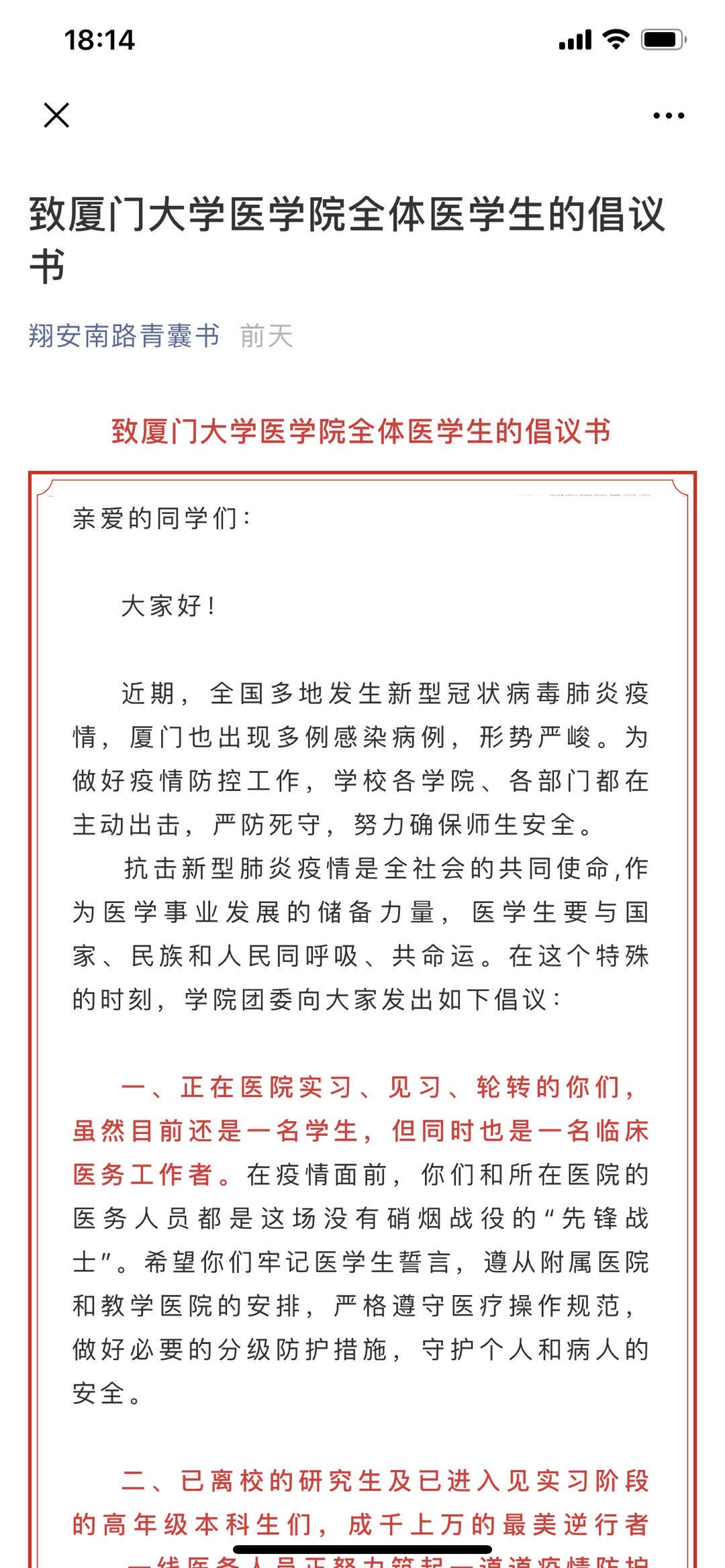 一线战役不仅是实体医院里的奋战,也包括网络医疗工作的开展。2月5日,我院在厦门大学附属第一医院规培轮转的2018级专业硕士刘佳雨、潘梦婷、陈丽华、曾荣娟、李诗琴、王舒等6名同学主动申请组团加入武汉长江日报组织的全国医师“在线问诊”,为各类患者答疑解惑的同时,也给予患者情绪上的舒缓。李诗琴说道:“我们虽然年轻,但疫情发生后,我们每天都在关注武汉……希望用专业知识帮助武汉市民早日渡过难关。”