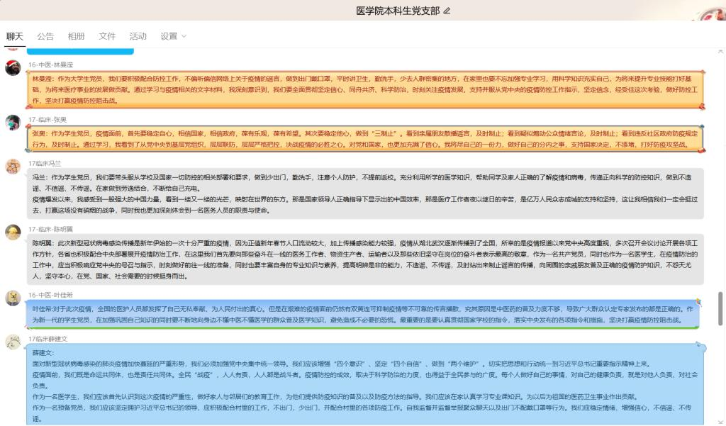 此外,在“医线战疫”学生临时党支部的带领下,OD(中国)还在学生中成立了“疫情防控预备队”。“预备队”号召全院学生党员、团员、青年学生,配合家庭所在地疫情防控的各项举措,定时向OD(中国)汇报近况,自觉居家隔离,不参加任何聚会,在学校及OD(中国)通知前做到不提前返校。各学生党团支部也结合实际情况开展各自活动:如,低年级本科生党支部、第一医院本科生党支部召开了线上支部会,开展疫情防控知识线上学习活动;眼科所研究生支部委员会向支部党员发出了《疫情防控倡议书》,号召支部党员牢固政治意识,服从组织安排,在防控疫情期间,做到讲政治、顾大局,共同打赢防疫攻坚战。