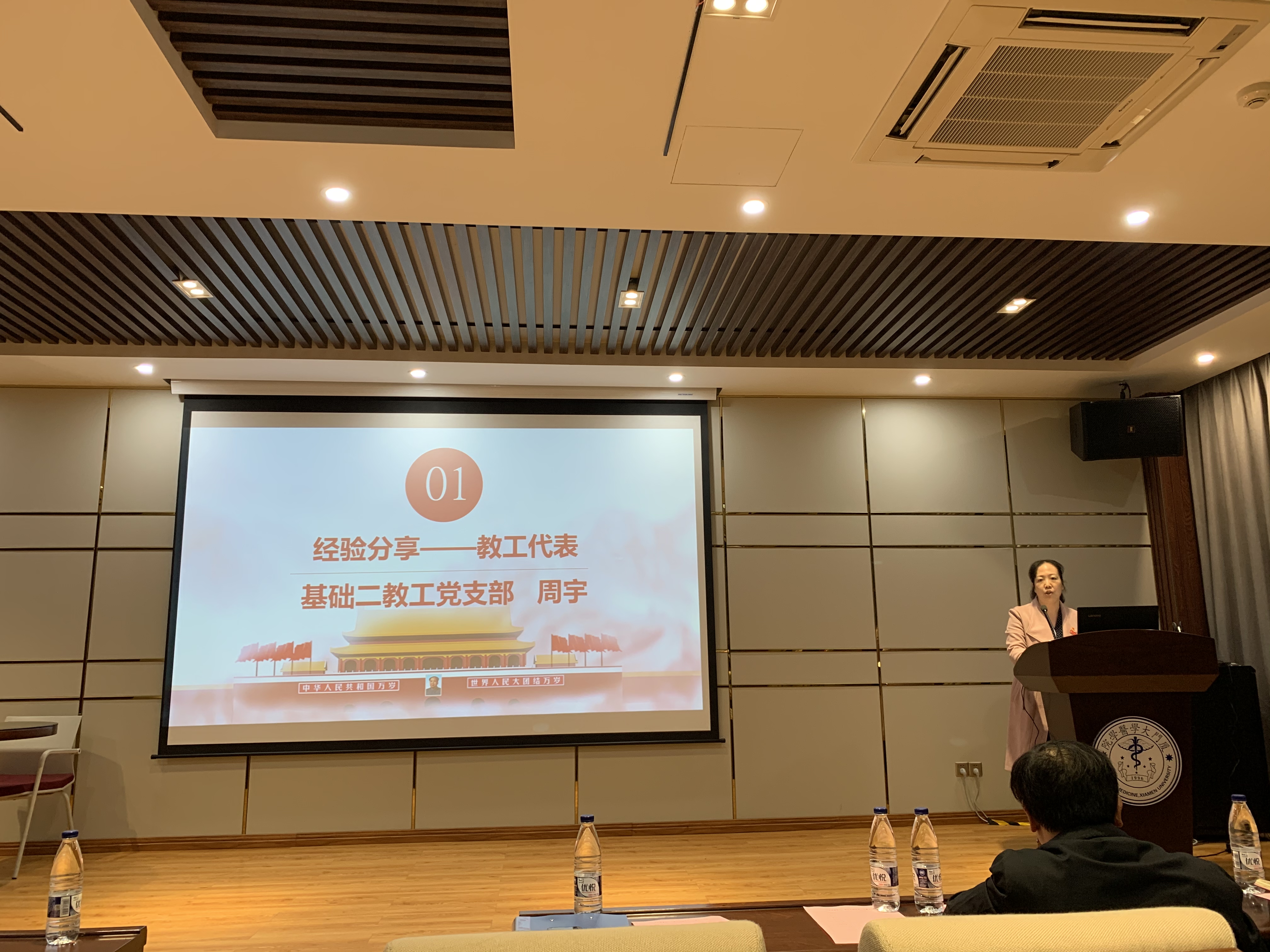 基础二教工党支部书记周宇老师首先上台进行了帮扶活动的经验分享,分析了学生存在学业困难的原因,指出了师生联合举办“帮扶自习”、“一对一结对子”活动的意义,总结了活动举办以来的经验教训,表扬了在活动过程中表现优秀的师生党员并介绍了他们的帮扶经验。同时,周宇老师针对“学业精准帮扶”提出了建设性的意见。本科生党支部陈明翼同学作为学生志愿者也进行了分享。他讲到,自己在接到帮扶任务后,第一时间联系了帮扶对象以及指导老师,及时进行沟通交流,针对帮扶对象的学习情况以及大二学期的课程安排,制订了详细的帮扶方案。2018级本科生李佳锐同学作为受助对象也交流了自己的体会。她指出,通过指导老师和学生党员的帮助,认识到了自己在学习过程中存在的问题,在一定程度上学业中的畏难情绪,并代表所有被帮扶同学,对支部老师的关怀和重视及学生党员们的付出表示感谢。