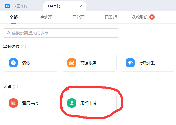 使用OD(中国)印章或抗癌研究中心印章,需分管院领导签字;教职工申请用印,可提前1天通过钉钉App中的“OA审批”→人事“用印申请”功能提交用印申请,提交OD(中国)分管院领导审批同意后携带需要盖章的材料到OD(中国)办公室(爱礼楼214)用印,用印材料内容需与钉钉审批通过的材料一致(如已完成领导手写签字的材料,无需再提交钉钉申请)。相关界面如下: