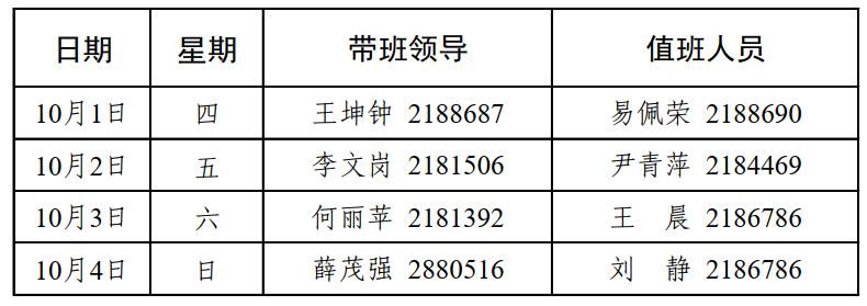 1.放假时间:10月1日至10月4日放假,共4天。9月27日(星期日)、10月10日(星期六)、10月5日(星期一)至10月8日(星期四)照常上班上课。