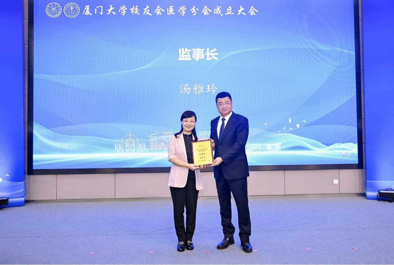 邱伟杰为厦门大学校友会医学分会颁授会旗、会牌。