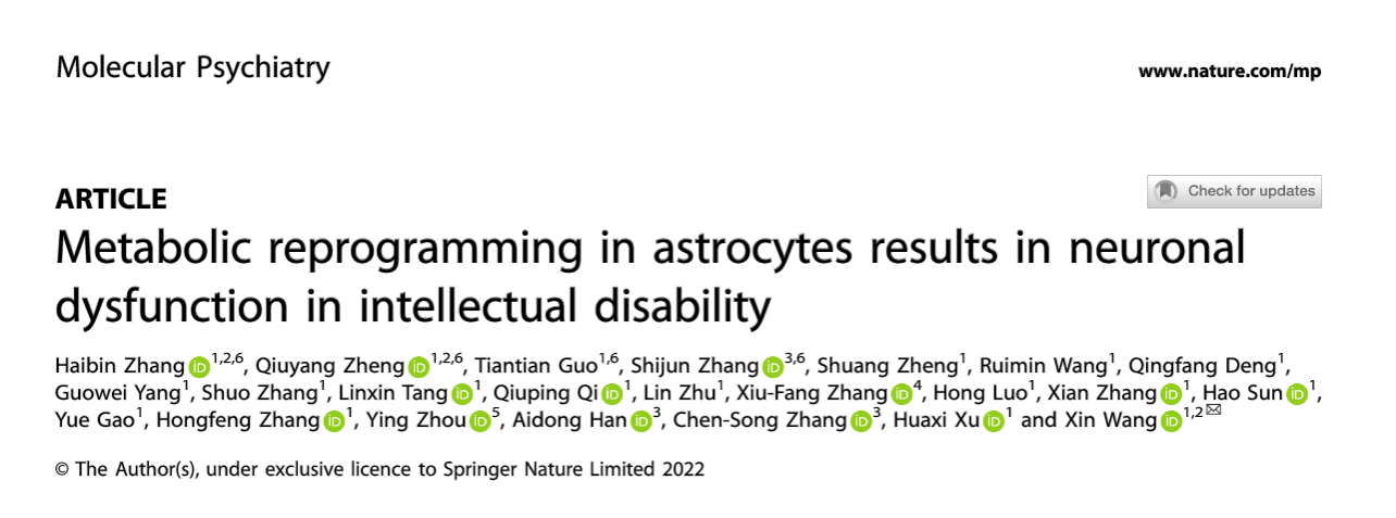 神经科学研究所王鑫教授团队发文揭示星形胶质细胞代谢异常参与智力障碍疾病的新机制