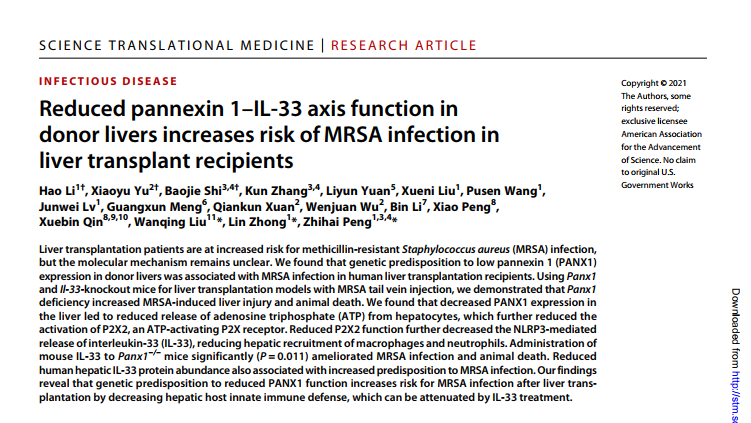 近日,厦门大学器官移植研究所、厦门市再生医学重点实验室和福建省器官与组织再生重点实验室彭志海教授在SCIENCE TRANSLATIONAL MEDICINE杂志(IF:17.956)上发表题为Reduced pannexin 1–IL-33 axis function in donor livers increases risk of MRSA infection in liver transplant recipients的最新研究成果。