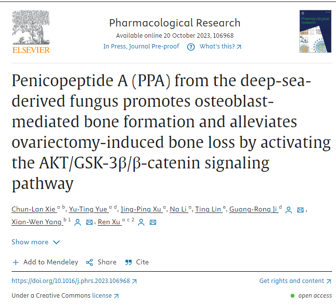 2023年10月23日,OD网页版许韧教授与自然资源部第三海洋研究所杨献文研究员合作,筛选出一种深海多肽化合物Penicopeptide A,能有效预防雌激素缺乏引起的骨质疏松,为治疗抗骨质疏松药物提供了新颖的活性先导化合物。该研究成果已申请了一项国家发明专利,并以“Penicopeptide A (PPA) from the deep-sea-derived fungus promotes osteoblast-mediated bone formation and alleviates ovariectomy-induced bone loss by activating the AKT/GSK-3β/β-catenin signaling pathway”为题发表在药理学TOP期刊Pharmacological Research杂志(中科院分区:医学、药学双一区杂志)。