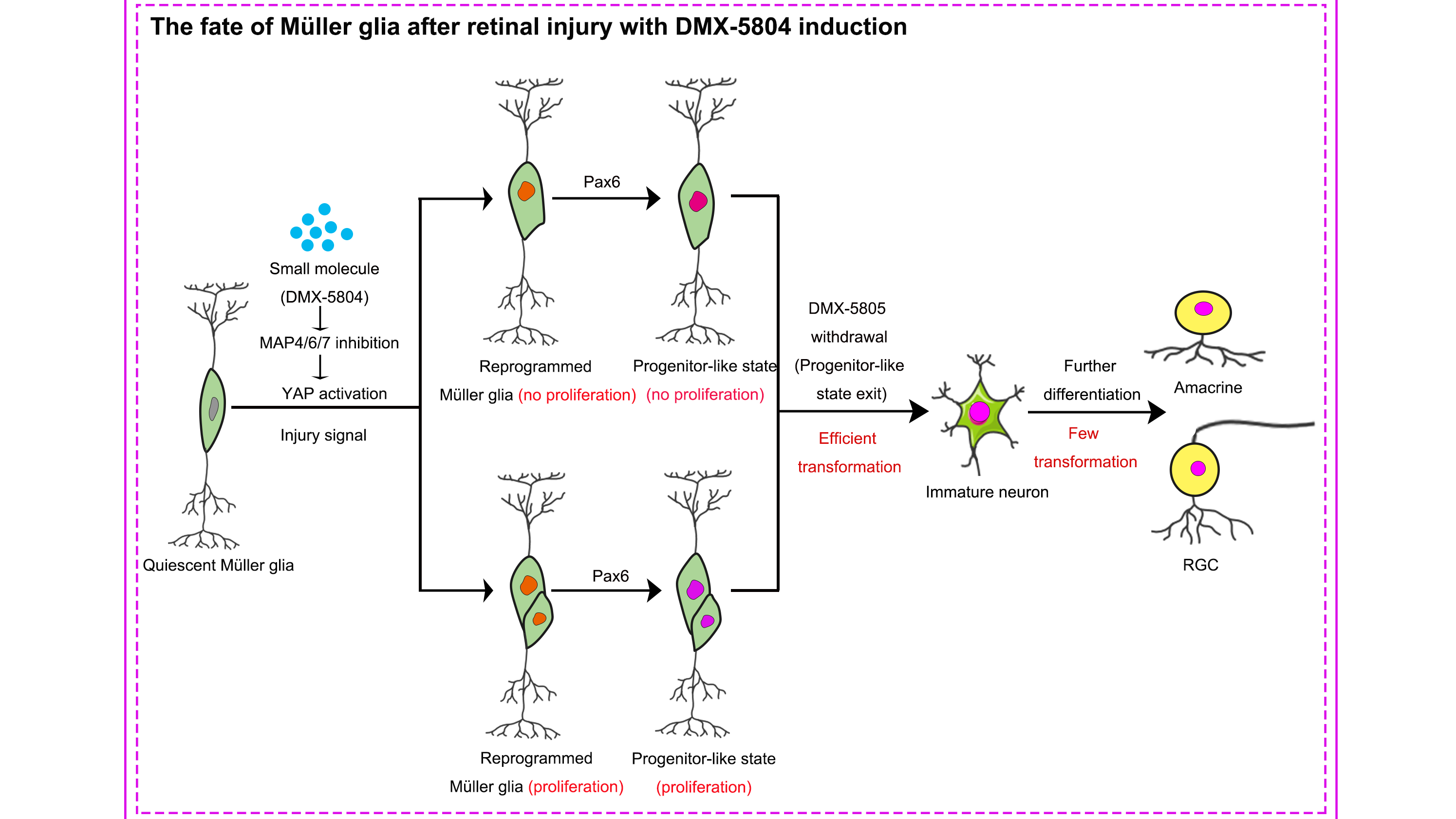 2023 年 7 月 13 日,厦门大学眼科研究所刘祖国教授和廖怿助理教授团队在 NPJ Regenerative Medicine 上在线发表题为 MAP4Ks inhibition promotes retinal neuron regeneration from Müller glia in adult mice 的研究论文。该研究发现,在成年小鼠视网膜损伤后,Hippo信号通路旁路途径的关键上游激酶MAP4K4、MAP4K6和MAP4K7(MAP4Ks)通过磷酸化下游底物抑制转录共激活因子YAP的活性,进而抑制穆勒细胞的神经元再生能力。采用小分子药物DMX-5804 靶向MAP4Ks可以促进损伤视网膜中的穆勒细胞再生功能性神经元。