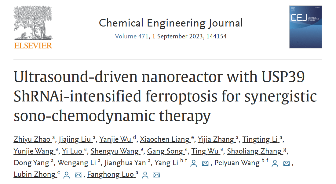 近日,医OD(中国)抗癌研究中心罗芳洪课题组在化工领域国际顶级期刊《Chemical Engineering Journal》发表了题为“Ultrasound-Driven Nanoreactor with USP39 ShRNAi-Intensified Ferroptosis for Synergistic Sono-Chemodynamic Therapy”的研究论文。论文报道了一种肿瘤微环境响应的超声驱动纳米反应器,可靶向肿瘤组织并通过基因沉默增强声动力-化学动力效应诱导肿瘤细胞铁死亡,发挥协同抗肿瘤作用,可望为肿瘤的靶向协同治疗提供一种新策略。