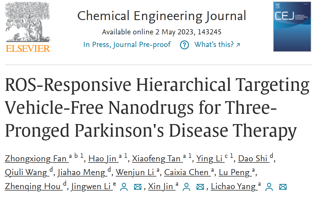 2023年5月2日,我院杨立朝教授、金鑫教授团队受超分子和无载体纳米药物等概念的启发,在化工领域国际顶级期刊《Chemical Engineering Journal》(影响因子16.744,中科院一区/Top期刊)在线刊发了题为“ROS-Responsive Hierarchical Targeting Vehicle-Free Nanodrugs for Three-Pronged Parkinson's Disease Therapy”的研究成果。
