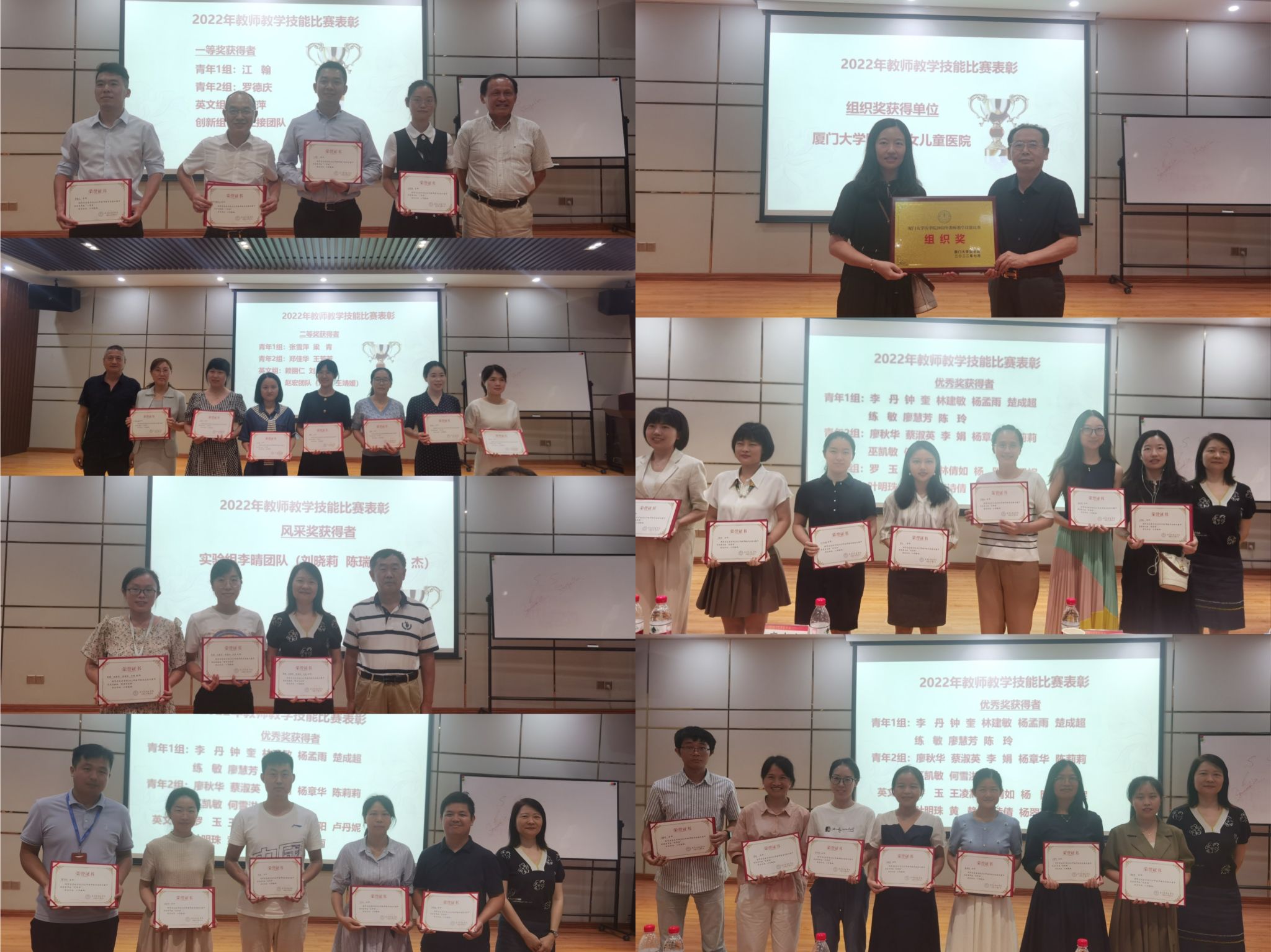 各参赛教师围绕参赛内容,用心编写教案,认真制作多媒体课件,热情洋溢、深入浅出的讲解,充分展示了各具特色的课堂教学风采。参赛教师们积极备战的态度、认真专业的表现、全面扎实的基本功受到评委和观摩老师们的一致好评。经过激烈角逐,附属第一医院江翰、附属东南医院罗德庆获得OD(中国)青年教师教学比赛一等奖,附属中山医院游萍萍获得OD(中国)英语教学比赛一等奖。此外,附属妇女儿童医院林育敏、附属东南医院王芳芳、附属第一医院刘琦获得最佳课件奖,附属第一医院周颖、附属中山医院廖秋华、附属翔安医院杨阳获得最佳教案奖;附属第一医院黄正接团队摘得教学创新比赛桂冠,李晴老师实验课程团队获得风采奖;附属妇女儿童医院获得组织奖。