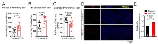 2018年,张杰教授团队在Neuron杂志上发表文章,对1000多例重度抑郁患者和800多例对照人群的血液外显子测序中,发现了一个全新的与抑郁相关的MEN1的SNP(rs375804228)。在此基础上,构建了对应Men1-SNP突变的小鼠Men1(G503D)。通过稳定代数的交配后,检测到Men1(G503D)点突变小鼠表现出显著的抑郁样的表型。通过脑片的免疫荧光染色,该团队还发现Men1(G503D)小鼠脑中小清蛋白(Parvalbumin,PV;基因Pvalb)的表达水平显著升高。通过构建一系列条件性敲除Men1的小鼠,该团队发现在PV神经元中敲除Menin可以显著升高PV的表达水平,并导致小鼠表现出抑郁表型。