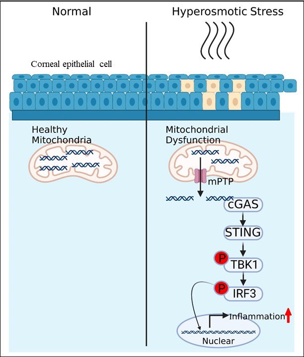 近日,厦门大学眼科研究所在Signal Transduction and Targeted Therapy杂志(IF=39.3)发表题为“The cGAS-STING pathway-dependent sensing of mitochondrial DNA mediates ocular surface inflammation”的研究论文。该研究发现,多种外界刺激可以导致角膜上皮细胞线粒体功能障碍和线粒体膜通透性转换孔(mPTP)的开放,使得线粒体DNA(mtDNA)泄漏进入胞质中,进而激活cGAS-STING信号通路从而介导眼表炎症。