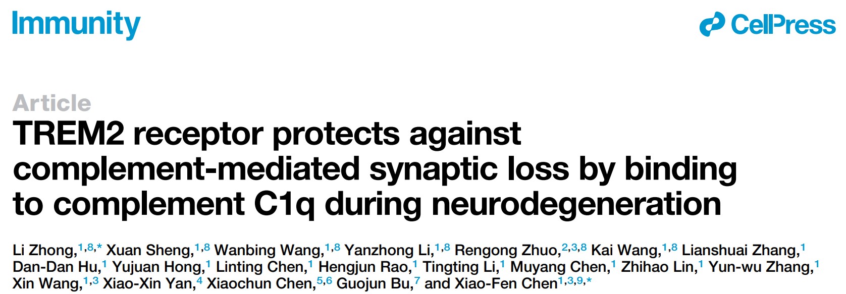 2023年7月12日,厦门大学陈小芬教授和钟力副教授团队在Immunity上在线发表题为TREM2 receptor protects against complement-mediated synaptic loss by binding to complement C1q during neurodegeneration的研究论文。