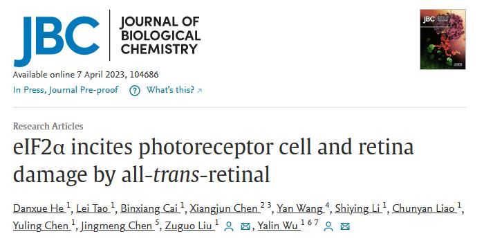 2023年4月7日,我院眼科研究所吴亚林教授课题组和刘祖国教授课题组合作在老牌经典期刊《Journal of Biological Chemistry》上发表了最新研究成果“eIF2α incites photoreceptor cell and retina damage by all-trans-retinal”。该论文揭示了真核细胞翻译起始因子 2α(eIF2α)在视觉循环紊乱诱发光感受器和视网膜色素上皮(RPE)退化中的关键作用及其机制,有望成为一种逆转黄斑病变的新靶点。该论文的第一作者为我院博士生和丹雪同学,通讯作者为吴亚林教授和刘祖国教授。