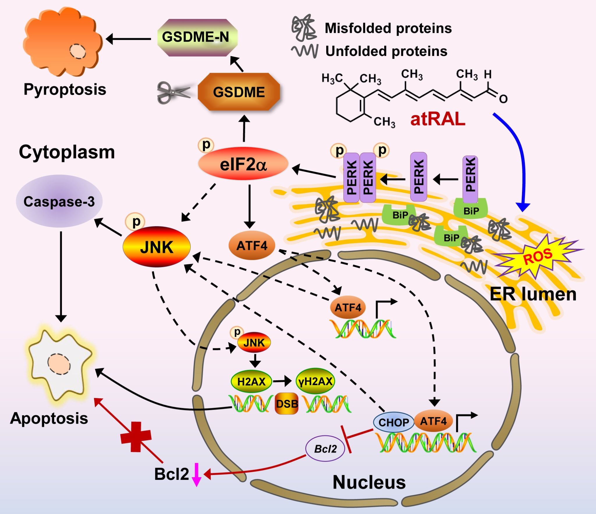 该研究创新性发现视觉循环紊乱至少部分地通过活性氧产生破坏内质网稳态,导致内质网腔内错误折叠或未折叠蛋白的聚集,与蛋白激酶R样内质网激酶(PERK)竞争与免疫球蛋白重链结合蛋白(BiP)的结合。BiP解离后,PERK被寡聚化和自我磷酸化,进而磷酸化胞质eIF2α。eIF2α通过不依赖于和依赖于转录激活因子4(ATF4)和ATF4/ C/EBP homologous protein(CHOP)轴的方式激活了c-Jun氨基末端激酶(JNK)信号通路。这是第一次在国际上报道了CHOP表达不是eIF2α激活JNK信号的唯一路径。JNK活化介导caspase-3激活和DNA损伤,从而引发光感受器/RPE细胞凋亡,并且发现CHOP促使光感受器/RPE细胞凋亡的能力与抑制抗凋亡Bcl2表达无关。eIF2α激活诱导成孔蛋白gasdermin E(GSDME)裂解产生GSDME-N,进而执行了光感受器/RPE细胞焦亡。此外,调控eIF2α减轻内质网应激能够有效地改善视觉循环紊乱引起的小鼠视网膜退化。研究还发现Salubrinal在细胞和动物水平均明显地减轻了eIF2α磷酸化,推翻了学术界普遍认为的“Salubrinal仅是eIF2α去磷酸化抑制剂”的认识。因此,靶向eIF2α可能是治疗黄斑病变尤其是干性AMD和STGD1的一种有前途的策略。