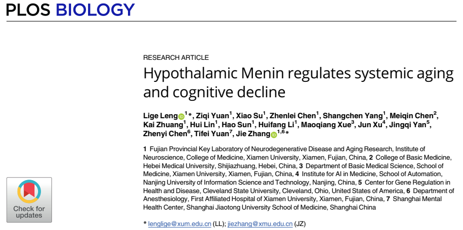 2023年3月17日,我院神经科学研究所张杰教授团队在Plos Biology杂志上发表题为“Hypothalamic Menin regulates systemic aging and cognitive decline”的研究论文。文中发现,下丘脑的Menin蛋白表达随衰老进程而逐渐下降,影响了机体的代谢稳态和D-丝氨酸的合成,进而导致衰老进程的加速和认知功能障碍。研究还发现在下丘脑回补Menin蛋白或在饮食中添加D-丝氨酸可以显著改善年老小鼠的衰老表型和认知障碍。