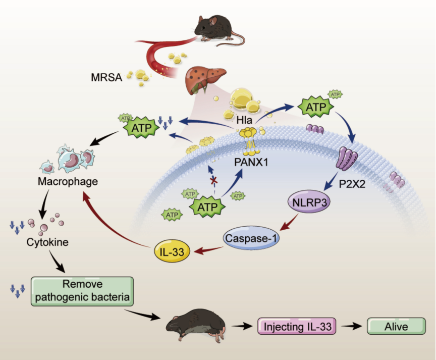 肝移植患者感染耐甲氧西林金黄色葡萄球菌的风险增加,但其分子机制仍不清楚。我们的研究发现低PANX1的遗传易感性在肝移植供肝中的表达与MRSA感染有关。通过MRSA尾静脉注射Panx1敲除小鼠肝移植模型发现,Panx1缺乏增加了MRSA引起的肝损伤和动物死亡。PANX1在肝脏的缺乏导致肝细胞释放的三磷酸腺苷(ATP)减少,进一步减少P2X2的活化, P2X2功能的降低进一步降低了NLRP-3介导IL-33的活化及释放,减少巨噬细胞和中性粒细胞在肝脏中的聚集。注射IL-33显著减轻Panx1−/−小鼠肝移植术后MRSA感染的死亡的发生。该团队最新发现,PANX1功能降低的遗传易感性通过降低肝脏宿主固有免疫防御增加了肝移植后MRSA感染的风险,而IL-33治疗可减弱这种易感性。
