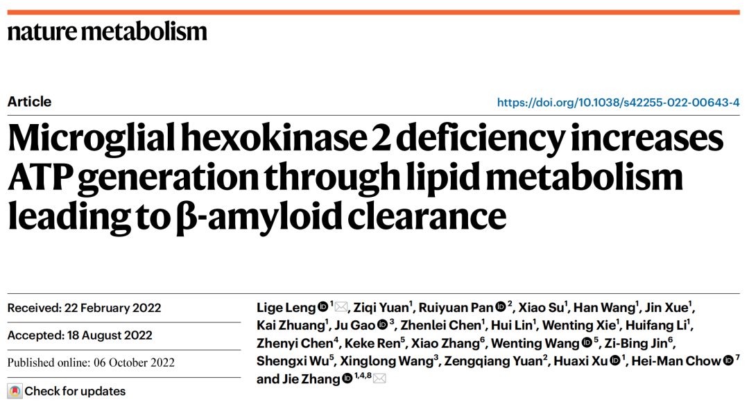 2022年10月6日,OD网页版神经科学研究所张杰教授团队在Nature旗下期刊Nature Metabolism杂志上发表题为“Microglial hexokinase 2 deficiency increases ATP generation through lipid metabolism leading to β-amyloid clearance”的研究成果。揭示己糖激酶2(HK2)调控糖-脂代谢转变对小胶质细胞ATP供能、吞噬、炎症的影响及机制。发现肿瘤临床用药:HK2抑制剂氯尼达明可以显著提高小胶质细胞ATP产生和清除淀粉样蛋白沉积,并改善AD小鼠认知功能障碍的作用,为AD的防治提供了新的策略。