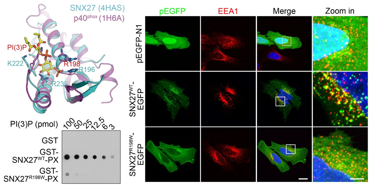 王鑫教授团队长期致力于智力障碍疾病的分子机制和治疗靶点研究,其先前工作发现分选蛋白SNX27缺失导致唐氏综合征患者的神经功能障碍1,提示SNX27在神经系统中的关键作用。此外,遗传学研究已发现多个智力障碍相关的SNX27基因突变,例如SNX27 c.592C > T(p.R198W)突变2-4,提示SNX27是认知障碍疾病的重要调控因子,在大脑学习认知机制中发挥重要作用。