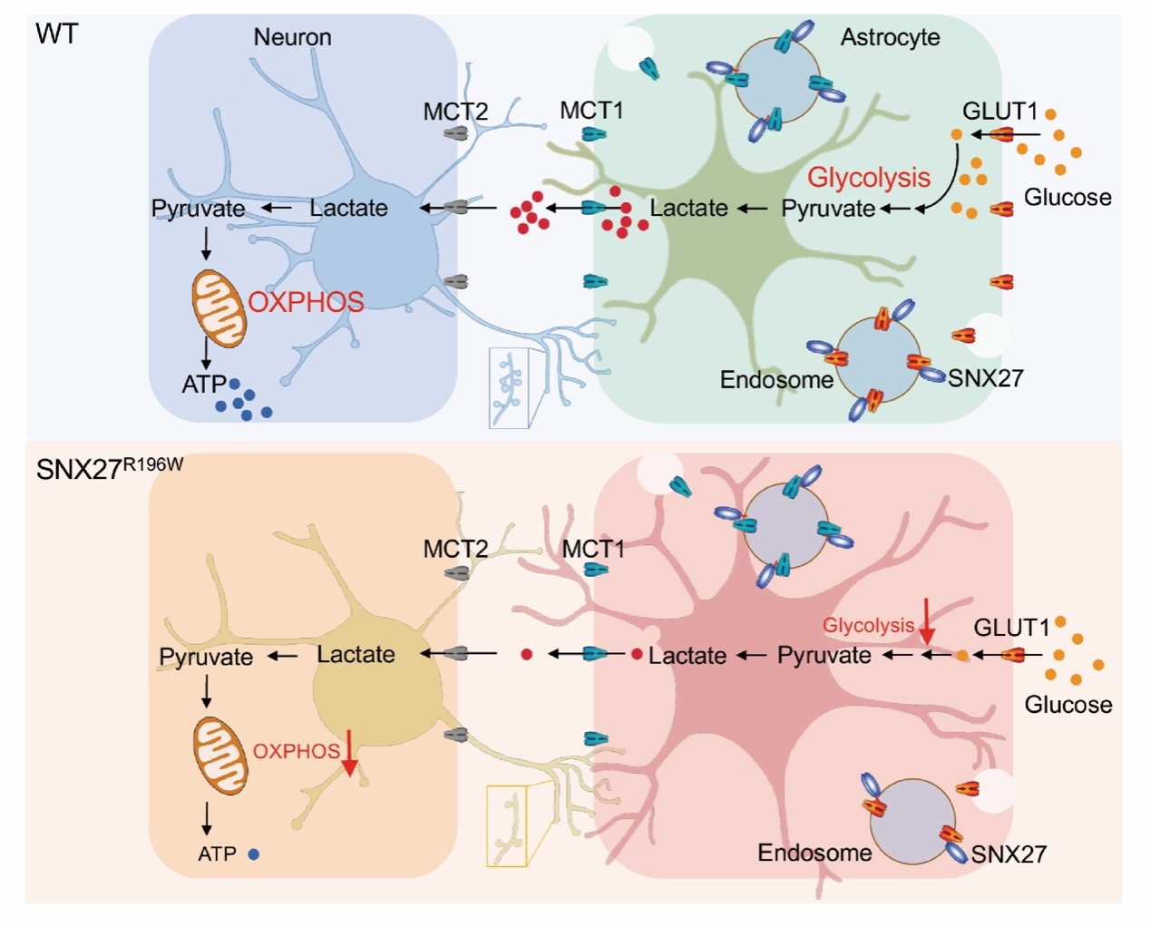为了阐明SNX27突变引起智力障碍的作用和机制,研究团队构建了智力障碍相关的SNX27p.R196W(对应人的R198位点)突变小鼠模型,发现SNX27p.R196W突变小鼠可以很好地重现智力障碍患者的认知损伤表型,包括发育迟缓、神经元突触丢失和功能障碍以及认知缺陷。机制上,研究团队发现SNX27 p.R196W突变通过破坏SNX27亚细胞定位,干扰葡萄糖转运子GLUT1上膜,导致星形胶质细胞糖酵解功能受损,糖酵解产物乳酸分泌不足,导致星形胶质细胞对邻近神经元能量供给匮乏。