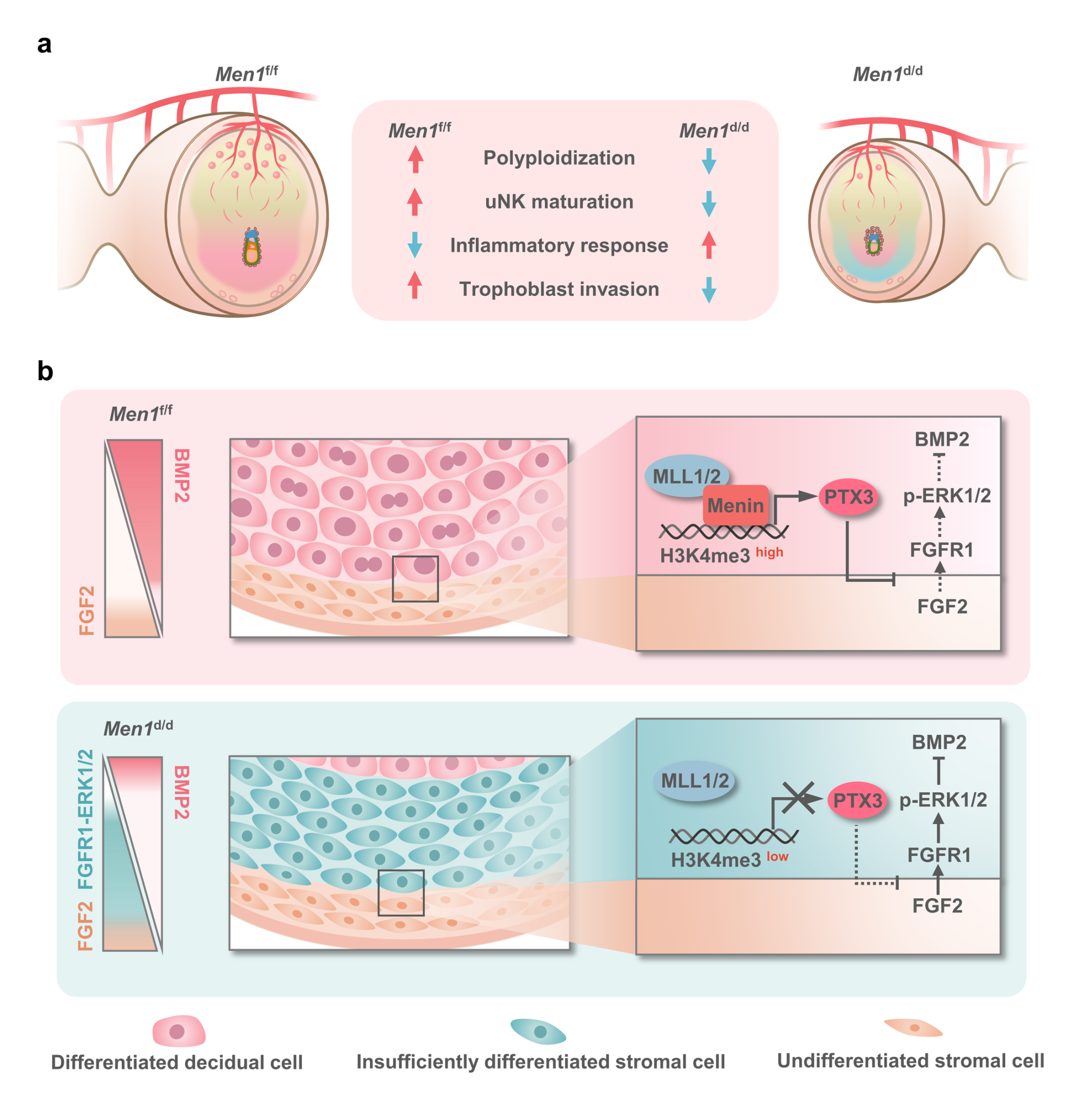 王海滨教授率领的团队通过构建母体子宫特异性敲除Menin的小鼠模型,发现子宫Menin的缺失导致雌性小鼠生育力显著降低,在妊娠中期出现胚胎的流产现象。进一步的表型分析发现Menin敲除小鼠妊娠失败主要是由于妊娠维持中蜕膜发育的缺陷。转录组测序数据显示子宫特异性敲除Men1(Menin编码基因)的小鼠蜕膜组织中,异常激活的FGF2-ERK1/2信号对Bmp2表达的抑制是导致基质细胞蜕膜发育分化不足的主要原因。在分子机制上,Menin在染色质上的分布调控了蜕膜化相关基因启动子处的H3K4me3修饰。结合转录组的数据发现,此前未引起重视的分泌蛋白PTX3,作为胞外基质中FGF2蛋白的天然抑制剂,是Menin-H3K4me3直接调控的下游靶基因。在蜕膜化过程中, PTX3能够抑制来自未分化基质细胞层的FGF2,防止FGF2以旁分泌的形式激活次级蜕膜区中的ERK1/2,保证Bmp2在蜕膜分化区域的稳定表达。