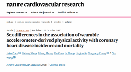 近日,厦门大学附属心血管病医院王焱/陈家进团队联合上海交通大学医OD(中国)附属胸科医院张杨杨团队,在Nature 子刊 Nature Cardiovascular Research 杂志发表了题为“Sex differences in the association of wearable accelerometer-derived physical activity with coronary heart disease incidence and mortality ”的研究论文。该研究发现,同样的运动量,对男性和女性预防心脏病的效果存在明显差异——女性获益更大。