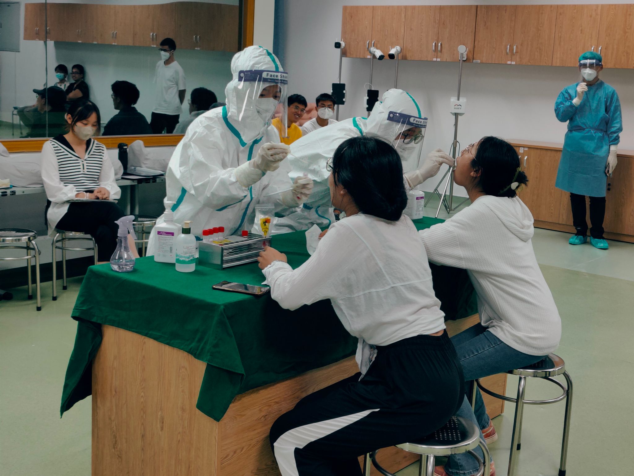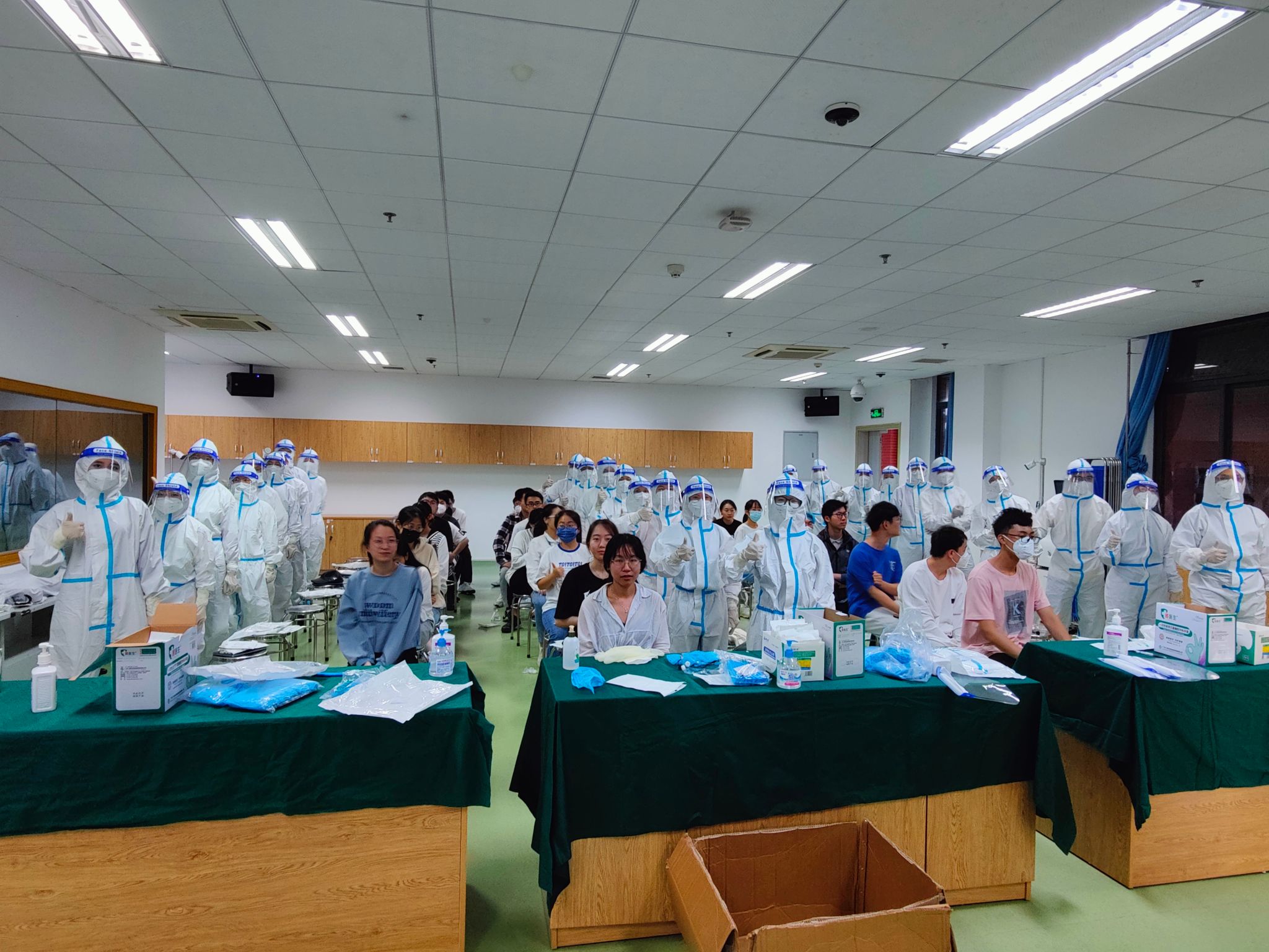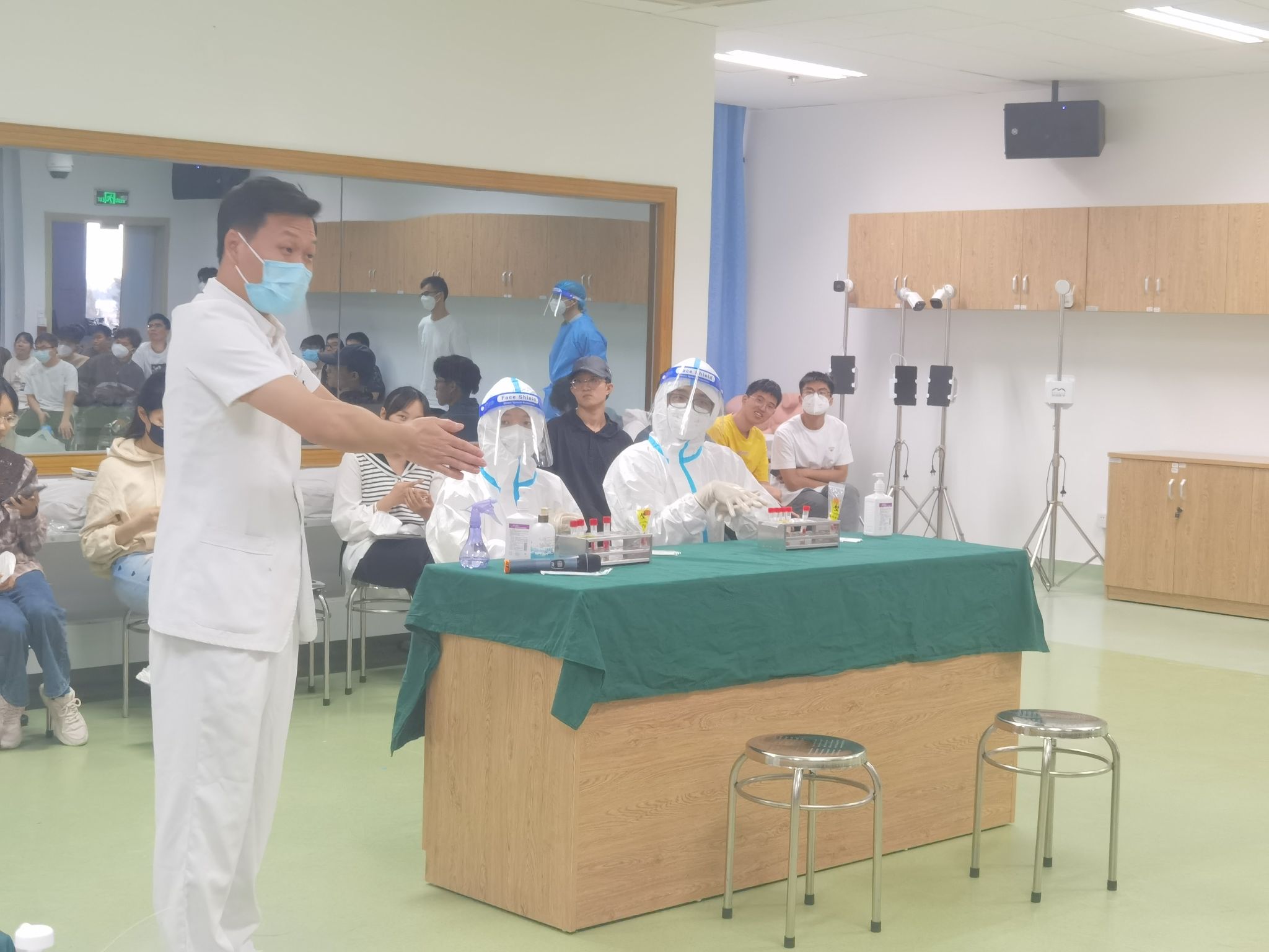 2022年10月28-29日,来自附属翔安医院护理部的张佳坡主任、钟奎老师和张贵老师,在医OD(中国)临床技能培训中心面向近200名学生进行了疫情防控相关操作培训,如七步洗手法、穿脱一次性隔离衣、穿脱防护服、口罩意外滑落应急处置方案、咽拭子采集和N95口罩佩戴和脱摘等。老师们分别对相关技能操作进行演示讲解和分组指导练习,并在课堂最后进行了社区核酸采样的全流程模拟。学生们被分为核酸采集工作者、保安、保洁、信息采集员、社区书记、样本转运工作人员和等待采样的群众等多种角色进行情景演练,同学们在一片欢笑声中对核酸采集工作流程有了更深刻的认识。未来的两周内学生会利用课余时间回到中心自行进行技能练习并拍摄操作视频用于考核,翔安医院将会组织老师对学生操作视频进行评分和反馈。通过操作考核者,OD(中国)将统一颁发《OD网页版新冠肺炎疫情院感培训合格证书》。