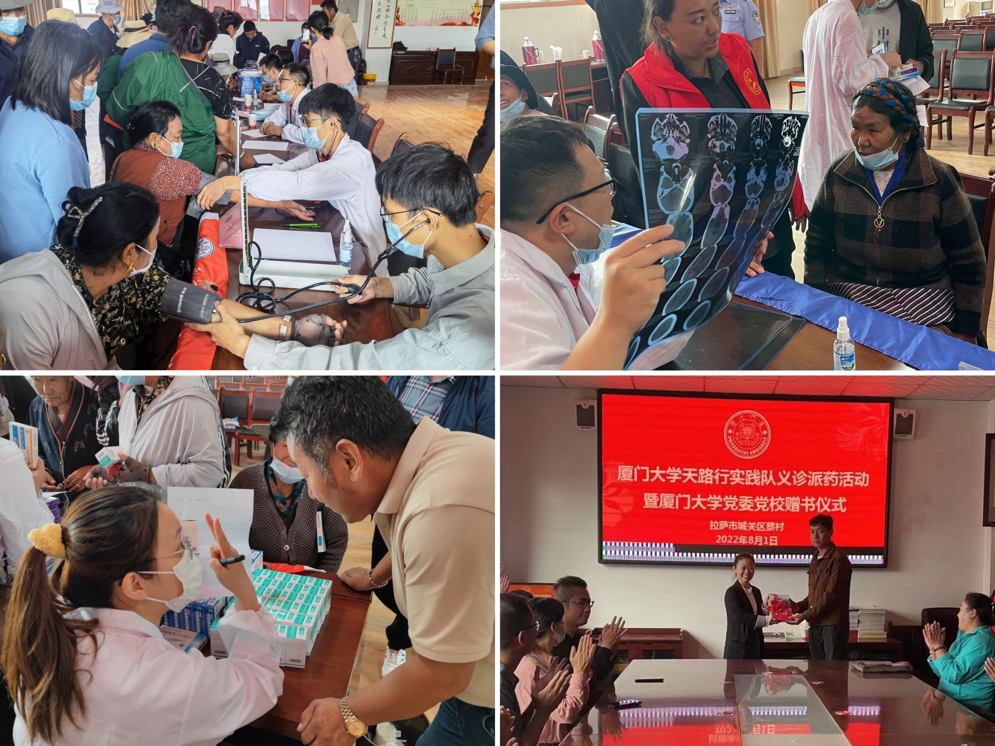 健康西藏建设是国家治边稳藏的一项重要工作,也是实现中国梦西藏篇章的重要内容。8月1日,天路行实践队发挥医学学科专业优势,来到拉萨市东郊蔡村为群众开展义诊,为100余名藏族群众提供健康咨询、血压测量、健康科普、赠药赠书等服务。“我们村长期缺医少药,你们真像一场及时雨”,实践队携手厦门大学附属翔安医院在义诊现场赠送胃病、关节炎等高原常见疾病药物10000余元。