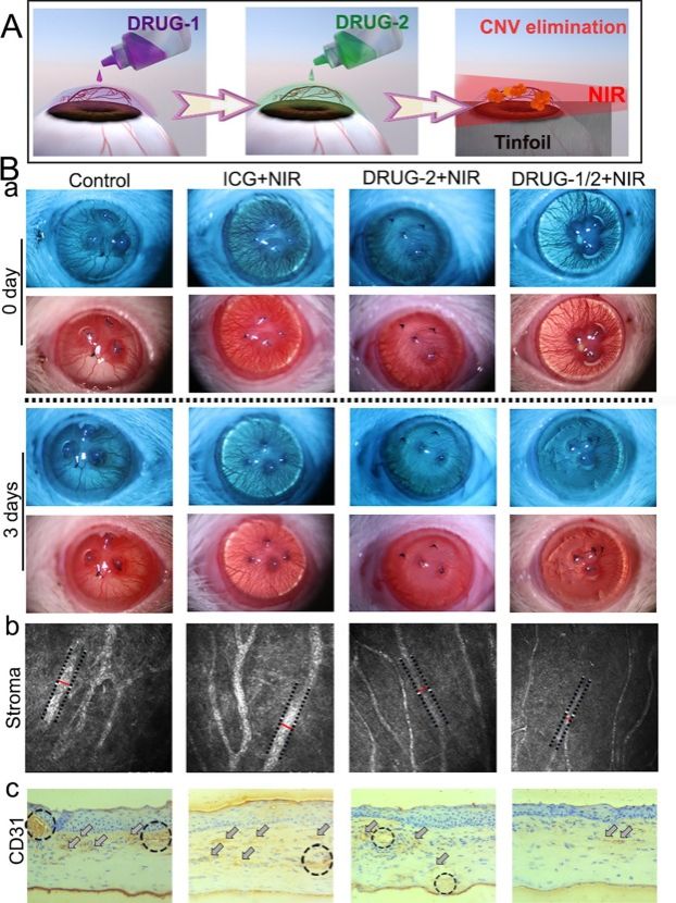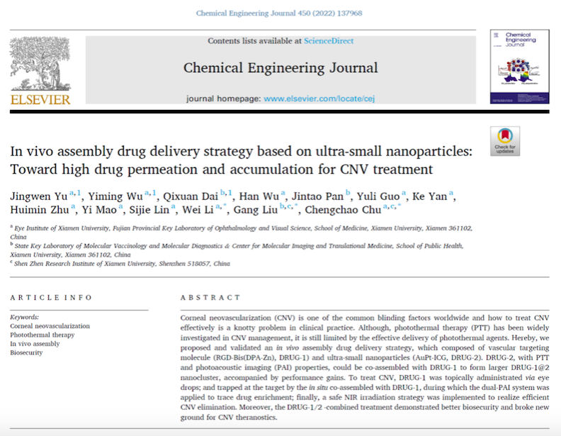 眼是人类接收外界信息最重要的器官。眼球最前端的角膜组织被喻为眼睛的窗户,其高度透明性是保持良好视觉的前提。很多原因诸如外伤、感染、严重干眼,甚至遗传性眼病可以导致角膜新生血管(CNV)形成,角膜透明度下降,最终严重影响患者视力。近日,工程技术与化学化工领域最有影响力的顶级刊物之一Chemical Engineering Journal在线发表了OD网页版眼科研究所李炜教授、楚成超副教授与公共卫生OD(中国)分子影像及转化医学中心刘刚教授团队的合作研究成果“In vivo assembly drug delivery strategy based on ultra-small nanoparticles: Toward high drug permeation and accumulation for CNV treatment”。该研究基于一种体内组装给药策略,仅通过滴眼液点药结合近红外激光照射,对角膜新生血管进行了高效而安全的治疗。