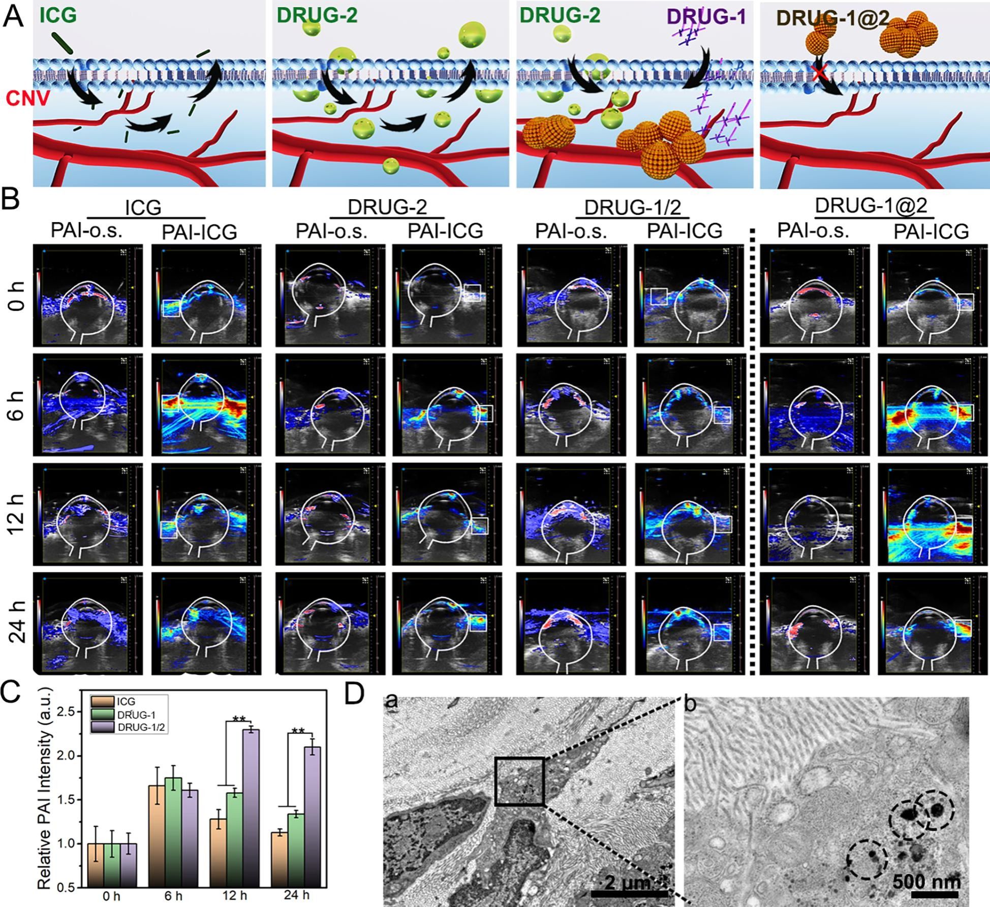 在体内实验中,研究人员通过滴眼液点药的方式分别将血管靶向前驱分子和超小型光敏颗粒在不同时间点滴在眼表面,两种药物先后进入血管内皮细胞,然后在细胞内进行自组装。该项策略不仅可以防止两者在细胞外自组装成尺寸较大的颗粒而无法进入细胞膜,而且在细胞质中进行自组装也相对延长了组合药物在细胞内存留的时间。团队使用SD大鼠角膜缝线诱导角膜新生血管,在分步滴加滴眼液后通过光声成像观察角膜新生血管内药物的富集程度。发现在对大鼠末次滴眼的6-12小时内,自组装光敏剂在角膜中仍有较高的富集程度,而在24小时后,角膜内的光敏剂几乎被全部清除。药物在角膜血管内皮细胞中的高富集率与低残留率显示出该方案优异的有效性与安全性。