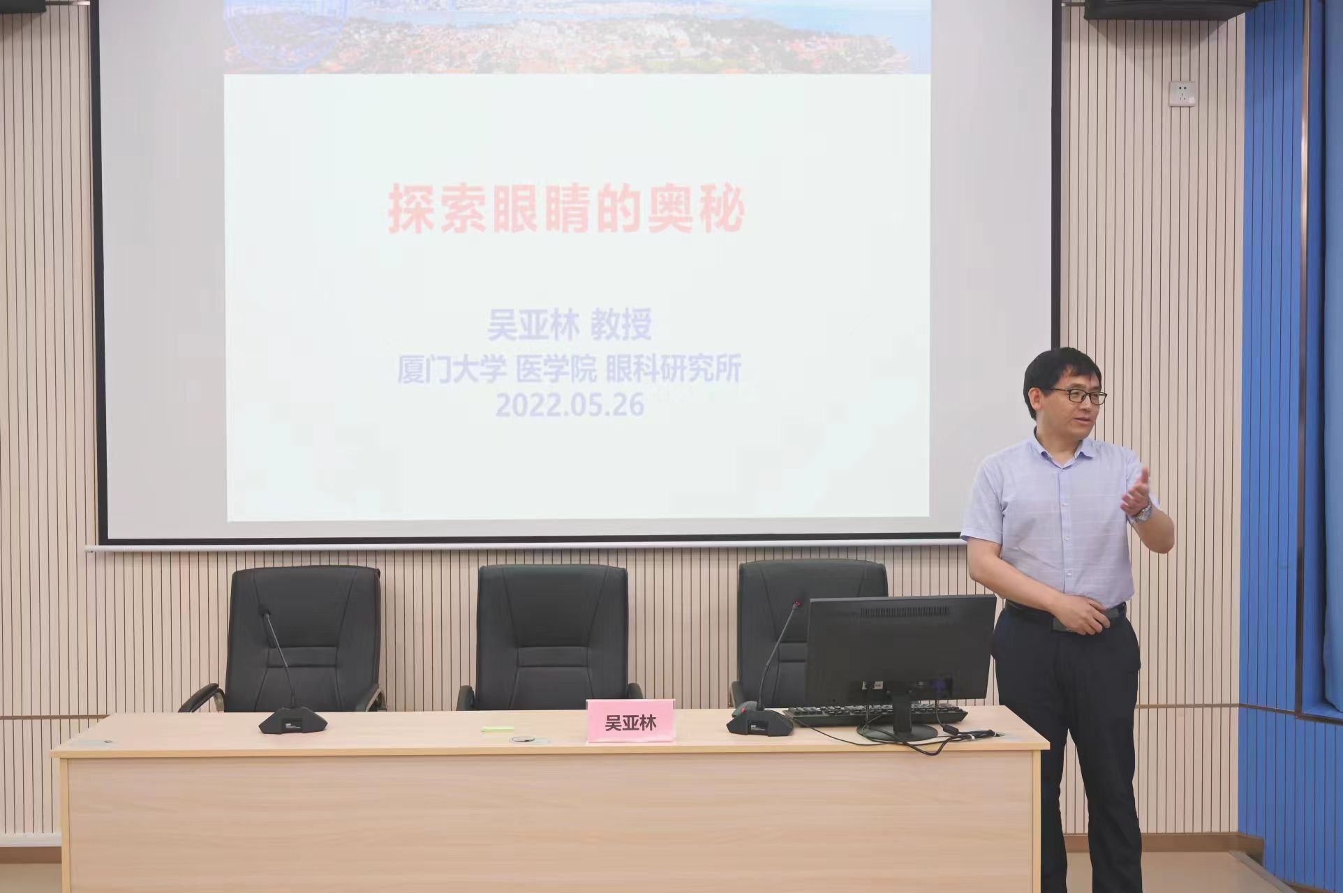 本次活动由同安一中副校长洪永灿同志主持。首先,眼科研究所吴亚林教授为同安一中的同学们做了题为“探索眼睛的奥秘”的科普讲座。吴教授从眼睛的结构讲到常见眼病,从近视的预防讲到科研的构思和设计,讲座中穿插了很多有趣的科学问题,同学们无不全神贯注、认真聆听。深入浅出的讲授,赢得了同学们热烈的掌声。接着,医OD(中国)教务办李晴主任进行了“建世界之大学 为吾国添异彩”的OD(中国)宣讲,介绍了我院的学科发展、专业特色、人才培养、招考分数等情况,为同学们未来报考提供了必要的参考资讯。