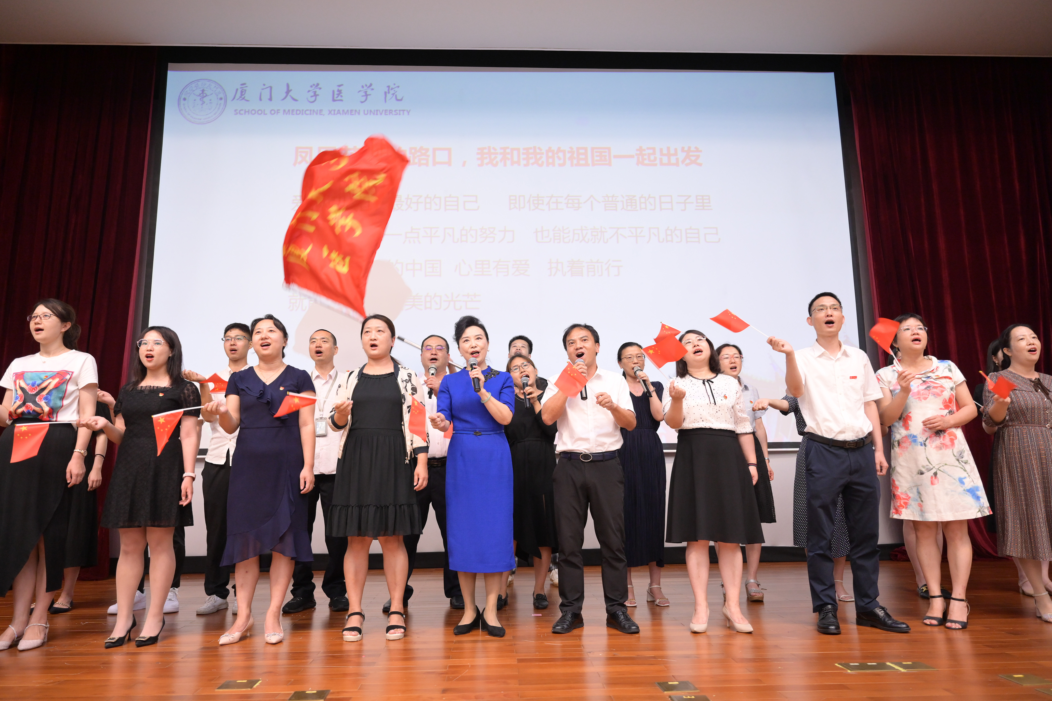主持人宣读疫情防控要求后,教师合唱团以快闪形式唱响《歌唱祖国》,迅速点燃典礼现场气氛,五星红旗全场飘扬,为建党百年献上诚挚祝福。