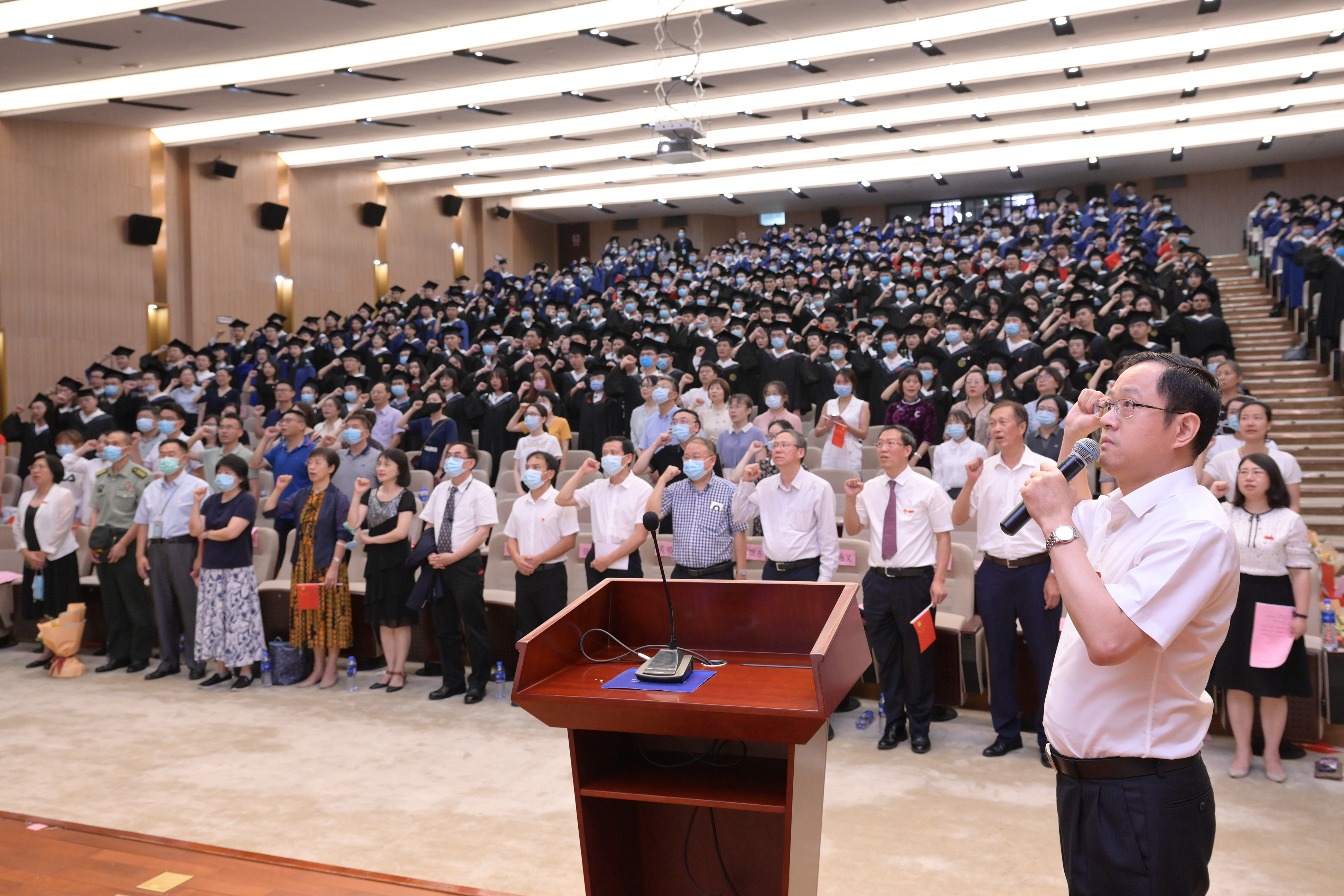 在副院长李炜教授的领誓下,2021届全体毕业生举起右拳,重温医学生誓言。“健康所系,性命相托,当我步入神圣医学学府的时刻……”铿锵有力的誓言响彻大厅,激励同学们在未来的学习、工作中常怀仁爱之心,为病患提供高质量的医疗服务。