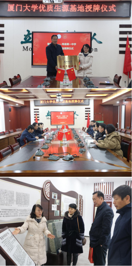 座谈会后,双方领导在春晖楼会议室举行优质生源基地授牌仪式。参加授牌仪式的有朱绍琴副校长及各年级主任。授牌仪式后,薛茂强副院长一行在朱绍琴副校长的陪同下,参观了校内的循理书院,了解寿县一中历史沿革。