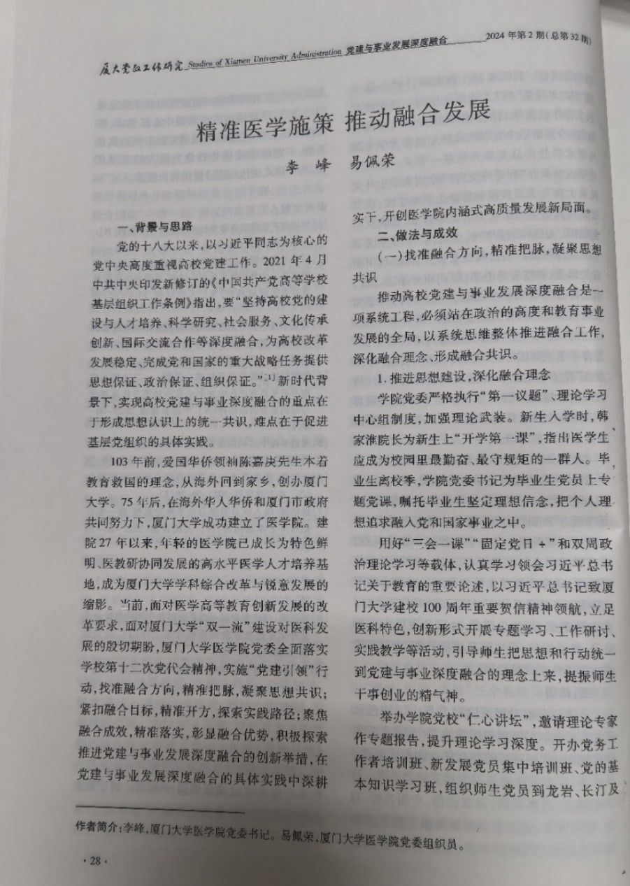 《厦大党政工作研究》刊发论文《精准医学施策 推动融合发展》