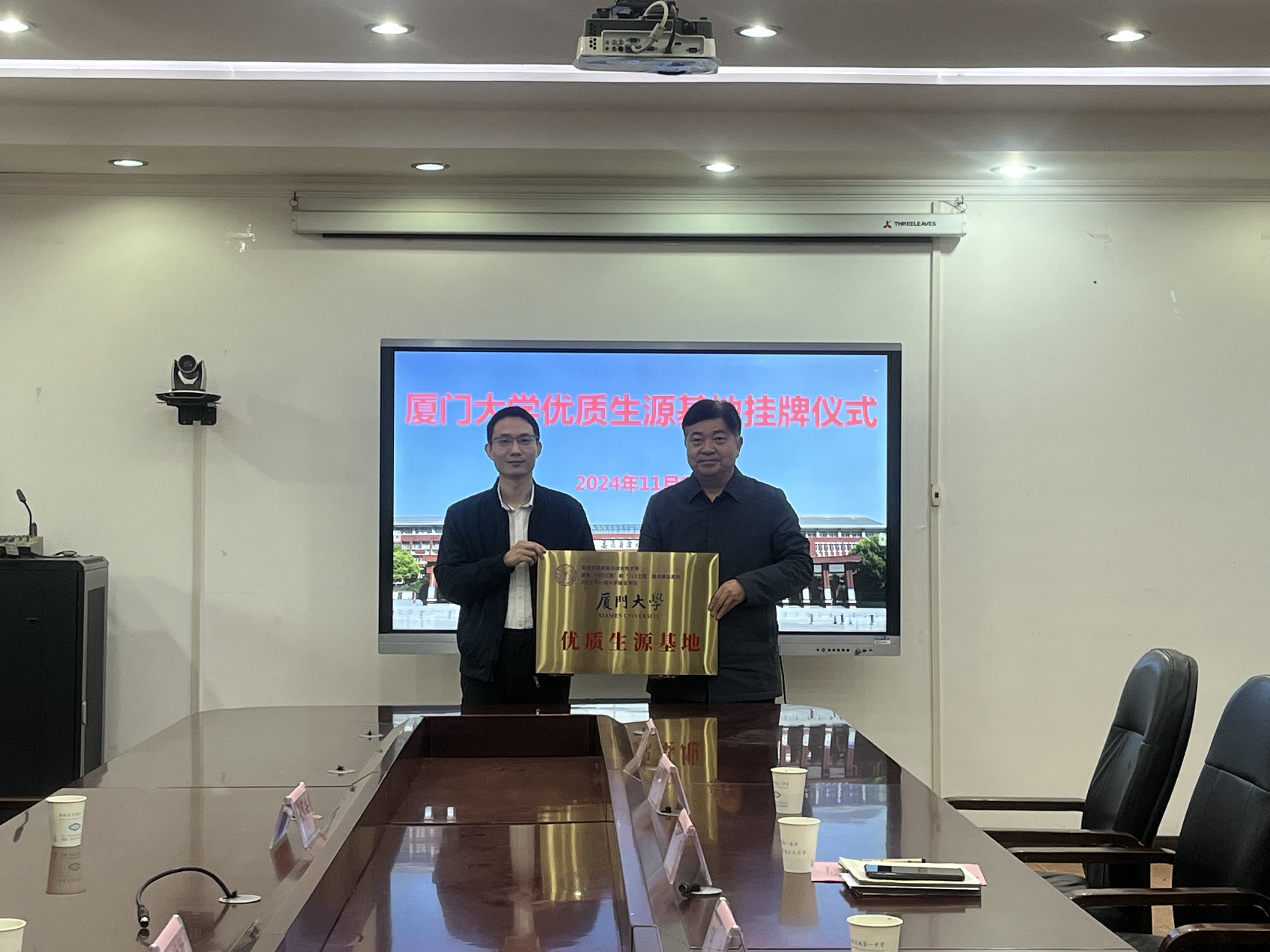 副校长邰国祥首先介绍了厦门大学安徽招生宣传组成员及中学参会领导情况,向王坤钟一行表示热烈欢迎。校长陈曙光对宿城一中的办学条件、生源情况、人才培养等情况做了整体介绍,希望双方以此为契机进一步加强互动交流,推动协同育人。授牌仪式上,王坤钟代表厦门大学与张涛书记签订协议书,并授予“厦门大学优质生源基地”。