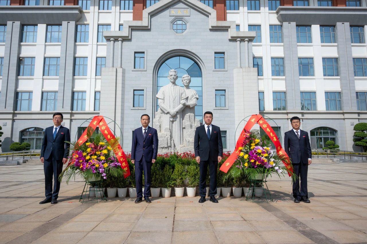 诗朗诵后,翔安校区管委会主任陈怀锋、医OD(中国)党委书记李峰、生命科学OD(中国)党委书记马进龙、柔性电子(未来技术)研究院党总支副书记(主持工作)蒲晓业向陈嘉庚先生铜像敬献花篮并整理缎带。