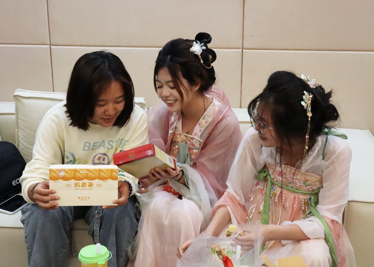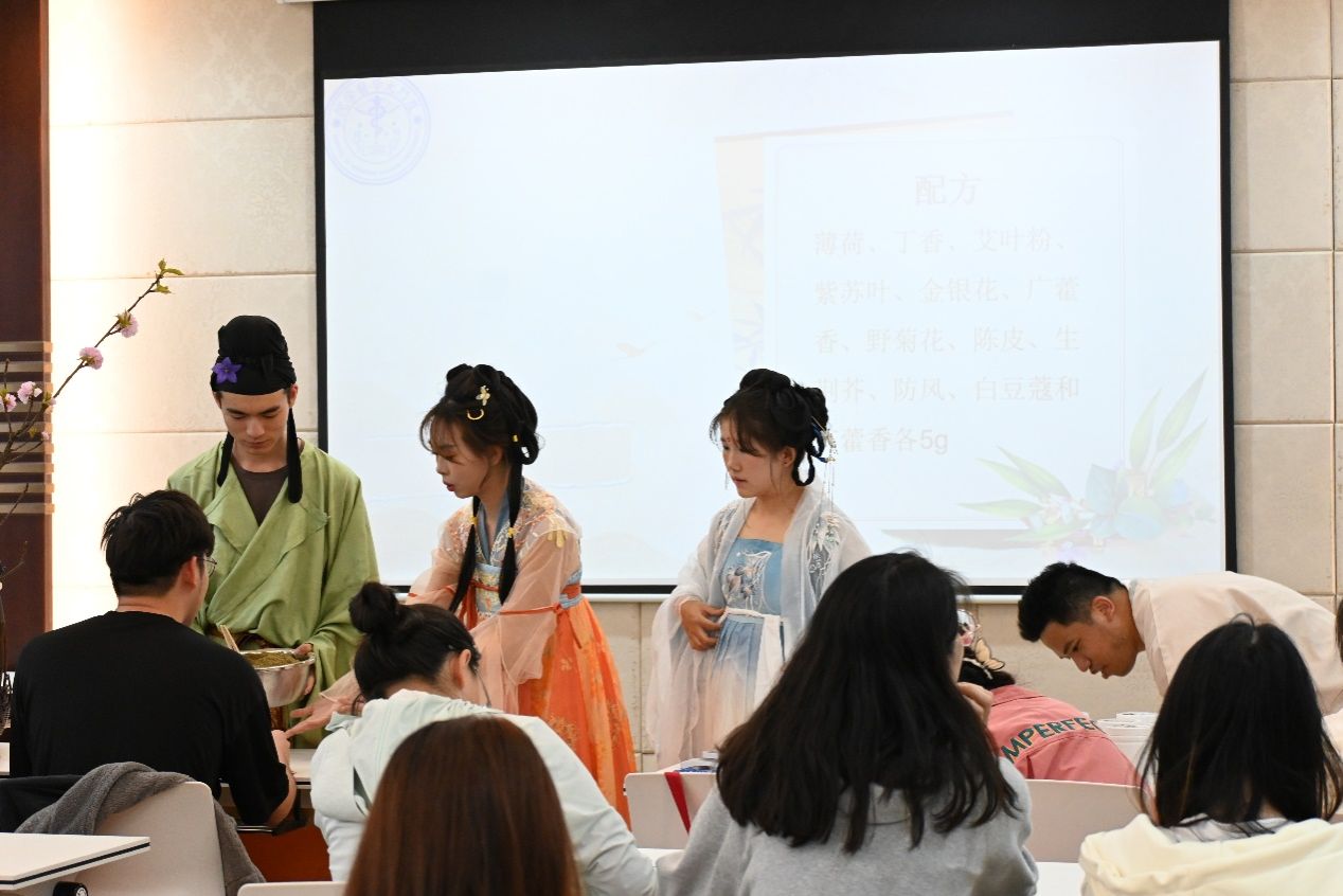本次活动主题为“花宣香明,心领神卉——多方洞见中医药本草之美”,现场分为香囊配制、识花辨卉、品茗调息、文创盖章及汉服体验等五大环节,以中医药经典为基础,通过赏药卉、制香囊、品佳茗、穿汉服等寓教于乐的形式,带领师生共同领略中医药文化的魅力。
