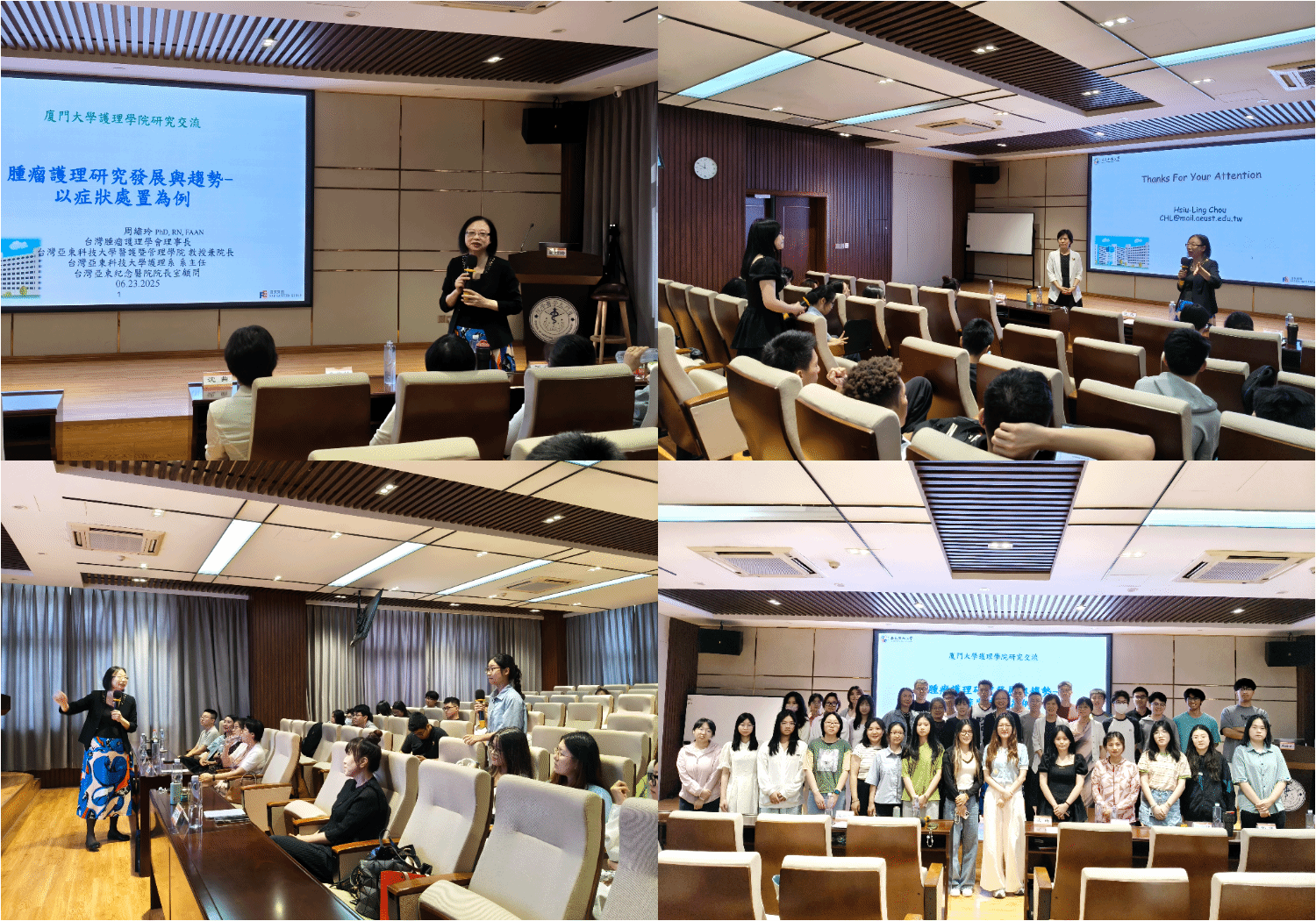 随后,周繍玲教授聚焦肿瘤症状学与护理研究未来发展,系统梳理了肿瘤护理从症状管理到全程照护的演进脉络。她结合台湾地区癌症诊疗质量认证体系,详细解析了护理敏感指标在临床实践中的量化应用,从疼痛管理、心理干预到康复指导,多维度展现了护理研究如何通过循证方法推动学科进步的过程。此外,她还分享了护理研究设计的创新思路,强调 “从临床问题到科研课题” 的转化逻辑,为从事护理研究的师生们在学术生涯的进一步发展提供了新思路。讲座结束后,周繍玲教授与同学们围绕 “护生科研素质”、“两岸护理教育差异”等问题进行了深度交流与探讨,讲座现场学术氛围热烈。