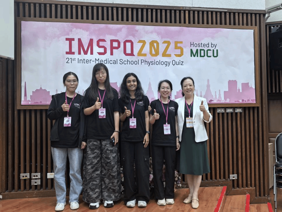 2025年7月16日至19日,第二十一届国际医学生理学知识竞赛(IMSPQ)在泰国曼谷朱拉隆功大学成功举办。我院由基础医学部周宇老师带队,选派临床医学专业王静、宗笑语,口腔医学专业赖滢琦及MBBS国际学生Sahana Bevoor组成代表队参赛。此次系我院继2017-2019年连续三年参赛后重返该项国际赛事,并首次选派MBBS国际学生入选代表队,标志着我院国际化人才培养体系取得重要进展。